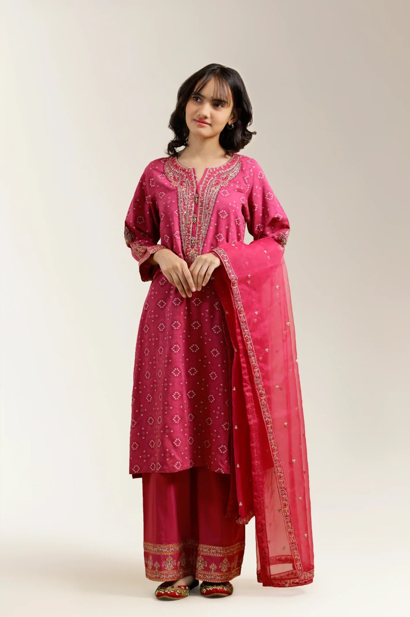 Sohaye introduces its Embroidered Teens 3PC Suit in a deep plum shade, radiating youthful elegance and festive charm. Crafted from premium Fancy Jacquard fabric, this three-piece outfit perfectly balances luxury and comfort. The intricate embroidery enhances the regal tone of plum, making it ideal for family gatherings, festive occasions, and formal events. Designed for teens who appreciate both trend and tradition, this outfit exudes sophistication in every detail.